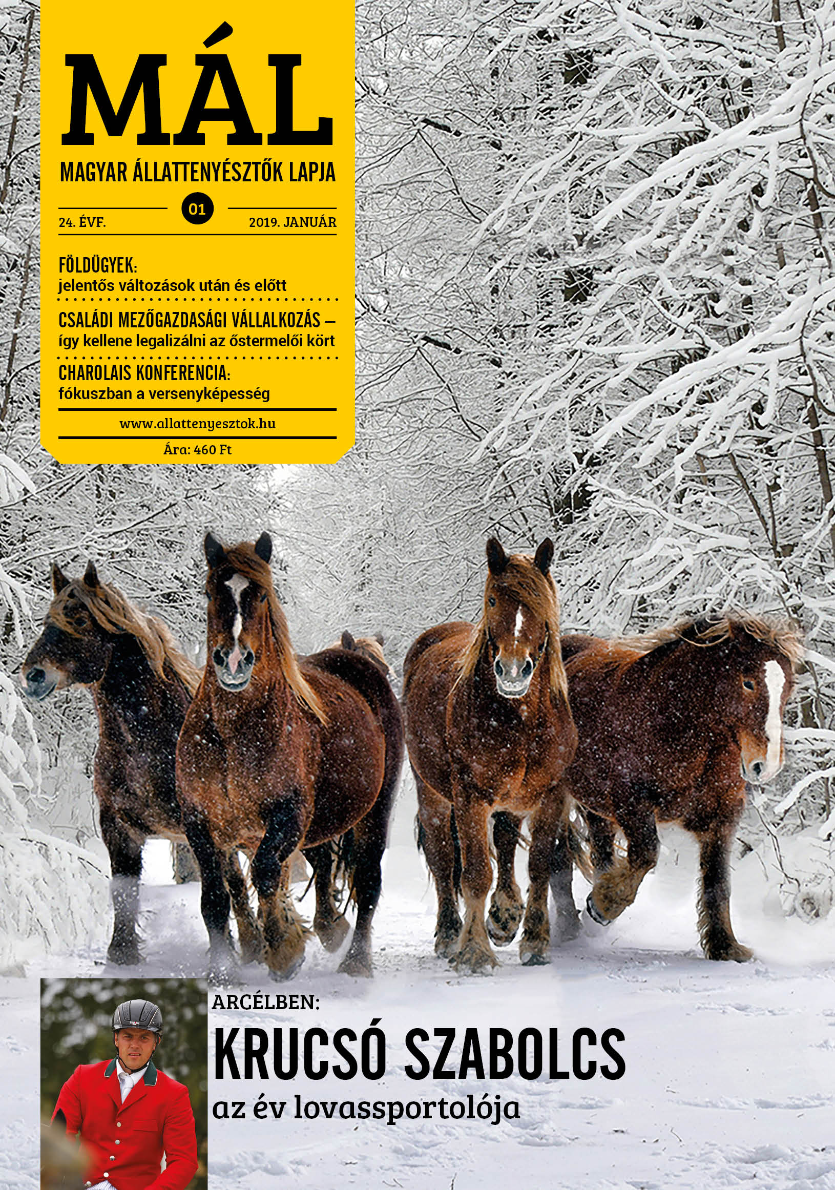 Aktuális tartalmunkból: A 2019. januári kiadványunk az Agrárminisztérium támogatásával valósult meg. Aktuális tartalmunkból: Vezércikk - Mozgalmas év elé nézünk Aktuális - Földügyek: jelentős változások után és előtt Aktuális - Rendezni kell a földbirtokviszonyokat a mezőgazdaság versenyképessége érdekében Kamara - Családi Mezőgazdasági VállaLkozás – így kellene legalizálni az őstermelői körtIstráng - Szilvásváradi Lovasközpont: a lehetőségek tárházaIstráng - Nekrológ: Elment a Dallos BandiIstráng - Kincsem Park: tovább a siker útjánPrém - Piaci fellendülésre várnak a csincsilla tenyésztőkGyepgazdálkodás - Legelők, rétek és kaszálók tápanyagellátásaLimousin és blonde d'Aquitaine tenyésztők hírlevele - Igyunk fajtáink sikerére!Tudomány - Ezekről olvashatunk az „ÁLLATTENYÉSZTÉS ÉS TAKARMÁNYOZÁS” tudományos folyóirat 2018/3. számábanFehér csizma - Ki gyógyítja majd haszonállatainkat?Húsmarhatenyésztés - Charolais-konferencia: fókuszban a versenyképességHúsmarhatenyésztés - Új tehénértékelési mutatót dolgoztak ki a francia charolais-tenyésztőkHúsmarhatenyésztés - „Olyan közösséget építünk, ahova jó tartozni”Takarmányozás - Szénhidrátok a takarmánybanFöldanya - Újévi fogadalmak, amiket meg is kell tartanunkJuhászkampó - A juhász jelképeJuhászkampó - Nekrológ: Elhunyt Pászthy György Vásártér - A tejpiac főbb tendenciái 2018-banArcél - Krucsó Szabolcs, az év lovassportolója230 Ft