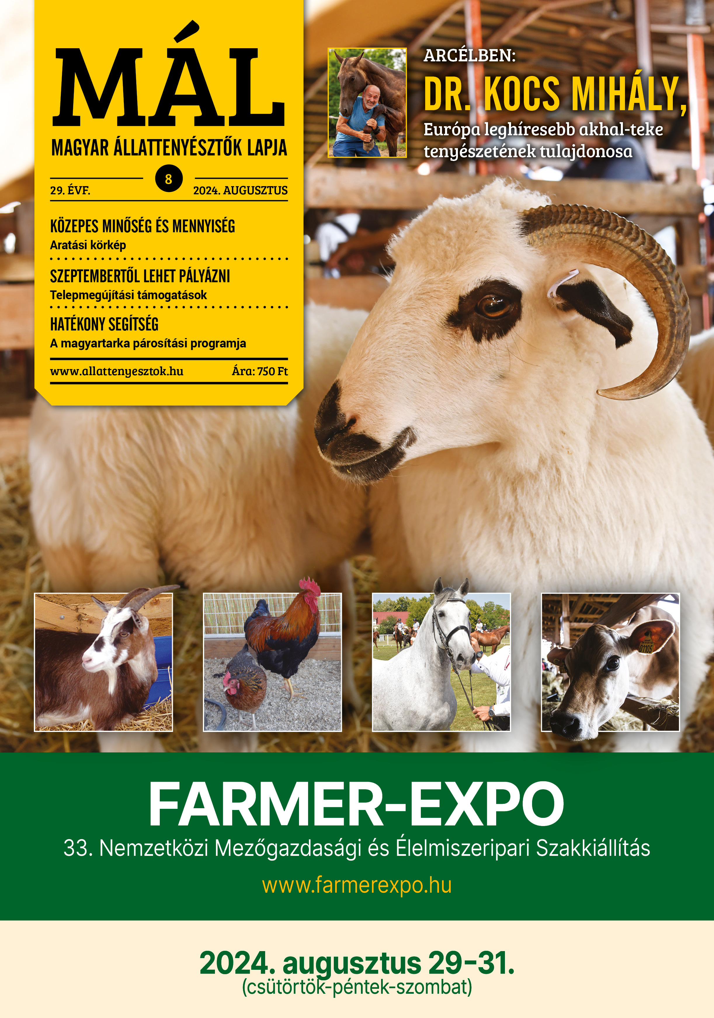 Aktuális tartalmunkból: Vezércikk - Silózási látképIdőszerű - Az extrém időjárás jelentős károkat okozott a növénytermesztésbenIdőszerű - Szeptembertől lehet pályázni telepmegújítások támogatásáraTejút - Hiszek a tejtermelők összefogásábanTejút - A tenyésztési eljárások és a tradicionális küllem újraértékelése Kamara - Heves viták az EU-ban az új típusú élelmiszerek kapcsánGulyásostor - Elkészült a magyartarka párosítási programjaPásztorjövő - Magyar pásztorok a marokkói etnobiológiai konferenciánIstráng - Akhal-teke Európa-bajnokság BábolnánIstráng - 56. Hortobágyi LovasnapokGyepgazdálkodás - Legelőkertes helyett jobb a szakaszos legeltetésGyepgazdálkodás - C4-es füvek hatása a gyep fenológiájára, hozamára és minőségéreAkvakultúra - Új kihívások a nyári forróságbanSertéspiac - Fiaztatás másképpNekrológ - Dr. Baltay Mihály (1942–2024)Juhászkampó - Egy tenyésztő saját tapasztalatai a dorper juhrólVásártér - Nőtt az élőjuh-exportunkArcél - Dr. Kocs Mihály 550 Ft
