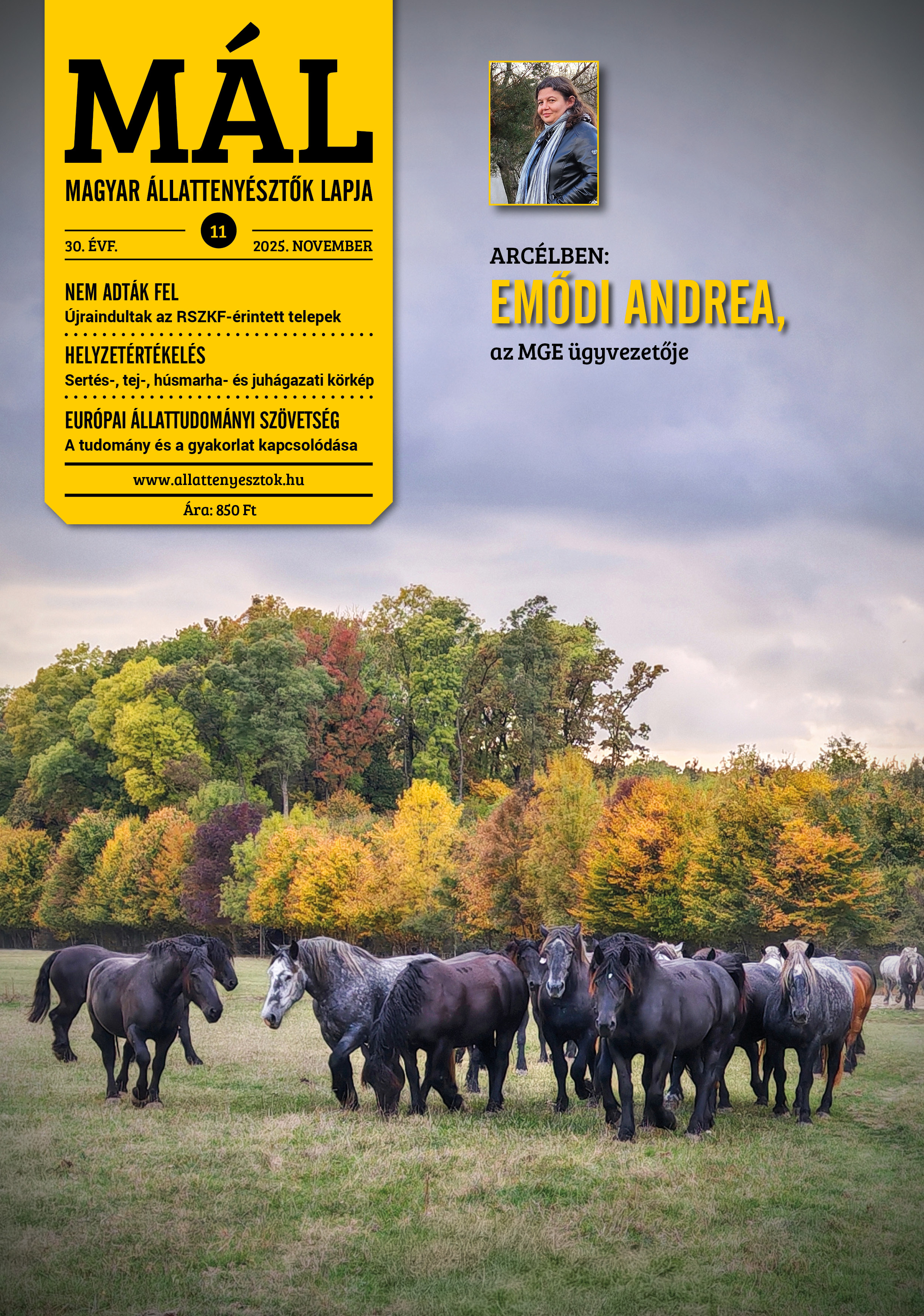 Aktuális tartalmunkból: Vezércikk - Higgyünk a szakmánk jövőjében!Időszerű - Lassan, de biztosan halad az RSZKF-érintett telepek újraindításaHelyzetkép - Sertés-, tej-, húsmarha- és juhágazati körkép Helyzetkép - Gyakorlati képzés az amr elleni küzdelem jegyébenKitekintés - EAAP: A tudomány és gyakorlat kapcsolódásának európai szervezeteGulyásostor - Látogatás a charolais fajta hazájábaGulyásostor - Nyilvános küllemi bírálati tanfolyam az MCTE szervezésébenTejút - Ismét a nemzetközi figyelem középpontjában a magyar tenyésztési kultúraGyepgazdálkodás - A növényvilág vegyifegyverei Az alkaloidok II.Gyepgazdálkodás - Lovak savós patairha-gyulladása a legelőnIstráng - Lipicai és nóniusz lovaink meghódították MarokkótIstráng - Megrendezésre került az első önálló gidrán ménvizsgaIstráng - Hagyományos értékek a modern családi lóbanPásztorjövő - A Nők a Pásztorságban csoport és a pásztorcsaládok országos találkozójaHídlás - Amikor a malac repülni fogHídlás - A globális sertéshúspiac elemzése 1. részAkvakultúra - A VIII. Halászati Kerekasztal tanulságai a hazai akvakultúra számáraAkvakultúra - Befektetés a jövőbeAkvakultúra - Új együttműködési lehetőségek?Vásártér - Tetőzött az élő és hasított marha áraArcél - Dr. Emődi Andrea650 Ft