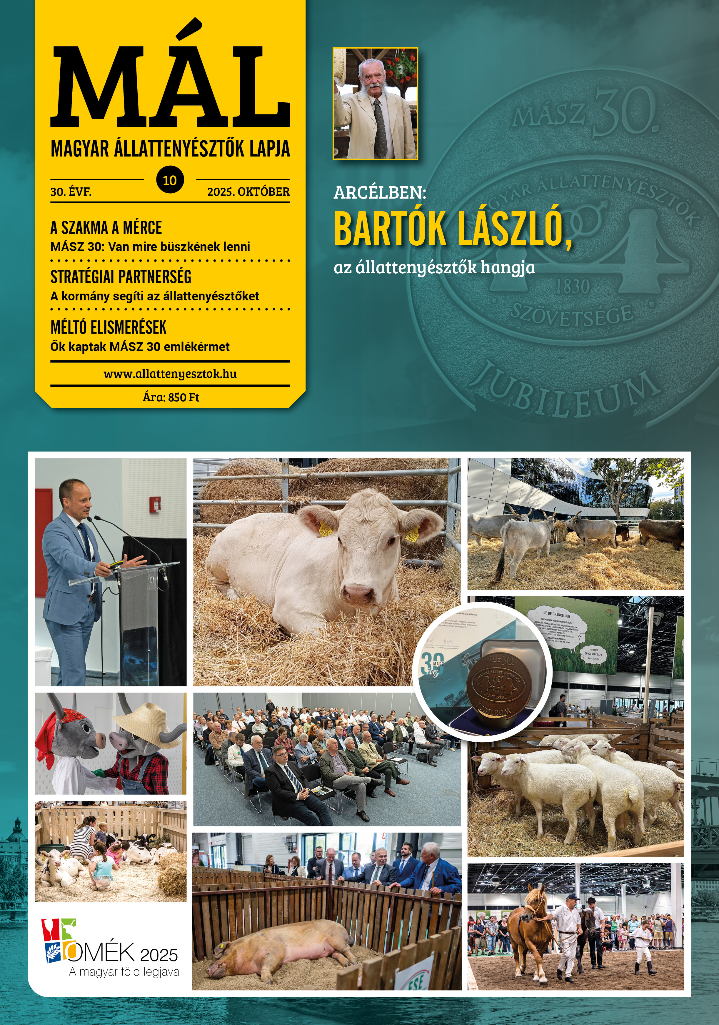 Aktuális tartalmunkból: Vezércikk - Tenyészállat-kiállítások: páratlan lehetőség számunkraMÁSZ 30 - Mász 30 – jubileumi ülés: van mire büszkének lenniMÁSZ 30 - A Magyar Kormány tudatosan segíti az állattenyésztőket és a tenyésztőszervezeteket MÁSZ 30 - Akik nélkül nem tartanánk itt Ők kaptak mász 30 emlékérmetKiállítás - Egyre jobb teljesítményt nyújtanak az állattenyésztőkKiállítás - A KÁN egyetemi napok díjazottjaiGulyásostor - 2025-ben ismét szakmai úton a limousin- és blonde d’Aquitaine-tenyésztőkTakarmányozás - TörésvonalPásztorjövő - Állattartás a regeneratív mezőgazdaságbanHdlás - Hazánk jelesre vizsgázott PRRS-mentesítésbőlAkvakultúra - A tógazdaságok jelentősége a víz visszatartásábanKamara - A digitális forradalom átalakítja az állategészségügyetJuhászkampó - A genomikai tenyészértékbecslés lehetőségei a hazai juhtenyésztésbenVásártér - Kukoricapiaci kilátásokArcél - Bartók László650 Ft